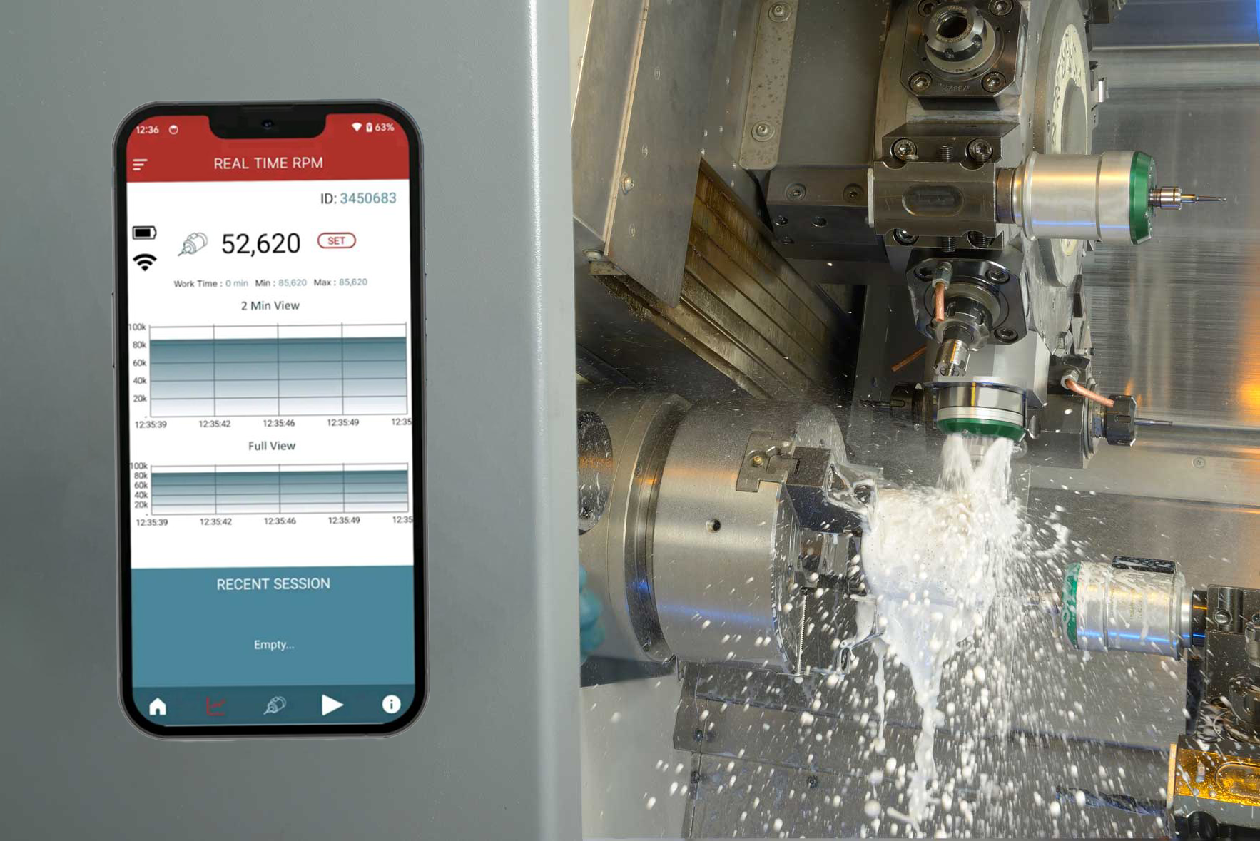 All Jet Spindles installed on a single machine can be monitored by one receiver. Only the coolant-driven spindle transmits the RPMs, while any other spindles remain in standby mode.